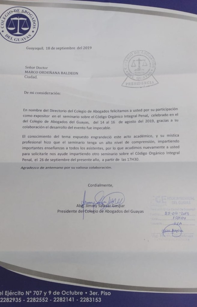 25 septiembre, 2019 Ab. Marco Ordeñana Baldeón Derecho, Jornadas Academicas Invitacion a Seminario del COIP – Colegio de Abogados del Guayas